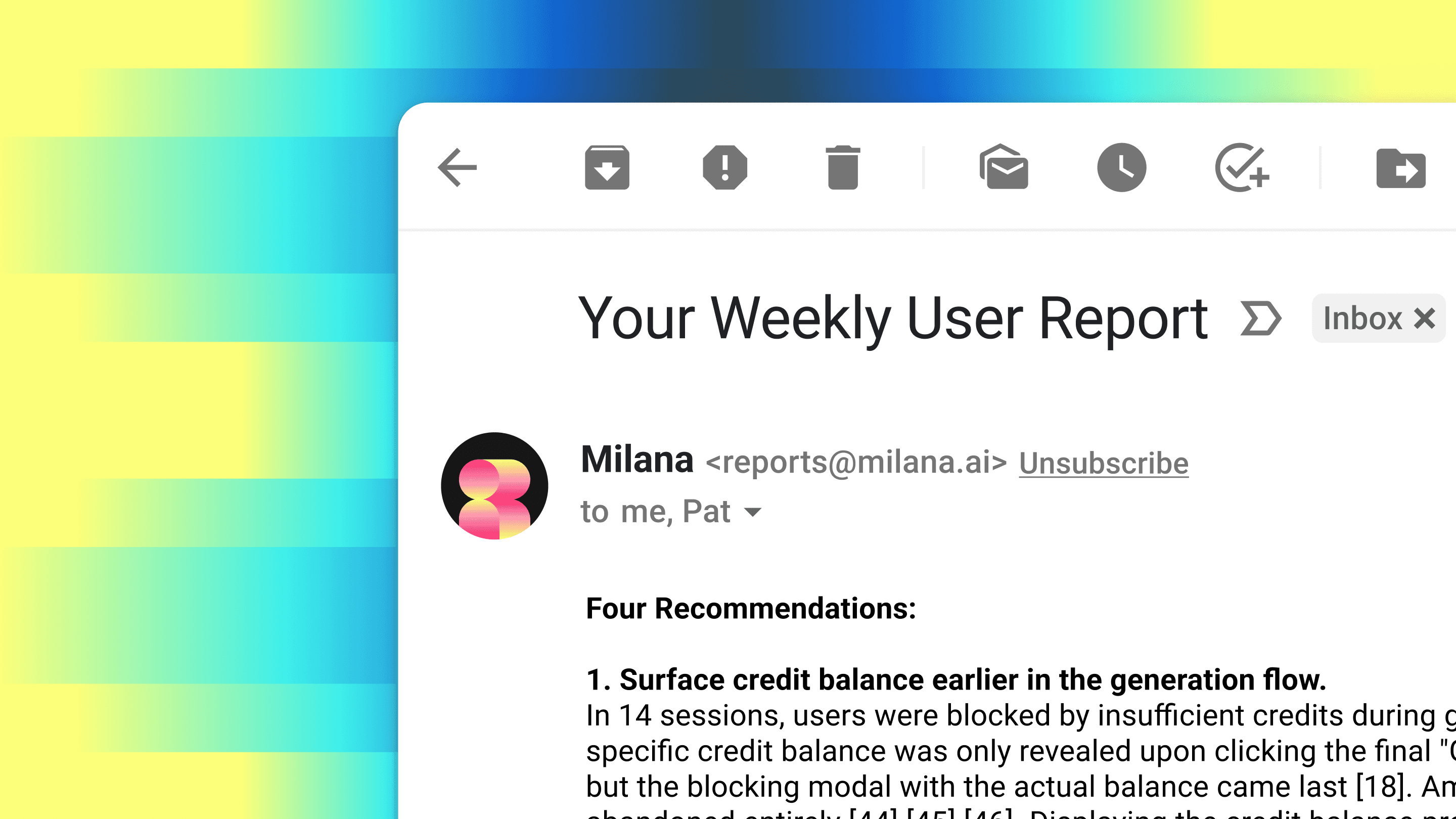 Milana is the AI product engineer for companies that care about experience. Milana analyzes every session, identifies what's hurting activation and retention, and delivers prioritized improvements with code attached. Daily.